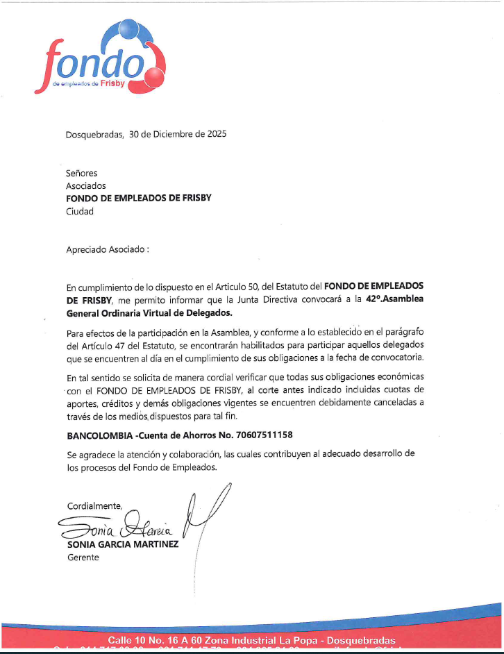 En cumplimiento de lo dispuesto en los Estatutos del FONDO DE EMPLEADOS DE FRISBY , se informa que la Junta Directiva convocará a la 42 Asamblea General Ordinaria Virtual de Delegados.